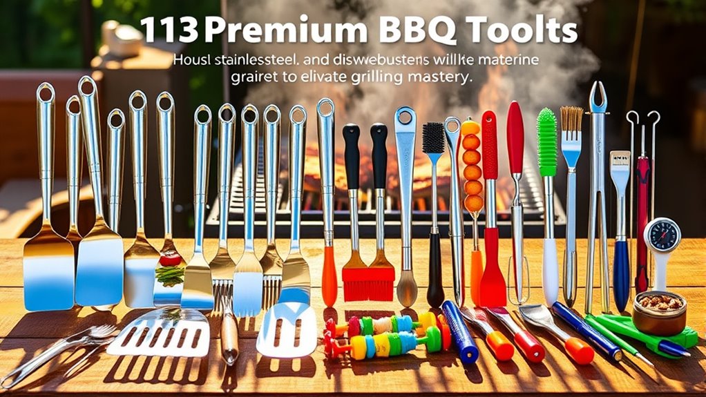 If you’re looking to elevate your grilling game in 2025, selecting the right BBQ tool set is key. The best sets blend durable stainless steel or high-quality materials with versatile tools like spatulas, tongs, thermometers, and specialized accessories. Whether you want a compact 13-piece set or an extensive 237-piece collection, there are options for all skill levels and needs. Keep an eye on durability, safety features, and organized storage—if you continue exploring, you’ll find the perfect match to boost your outdoor cooking.