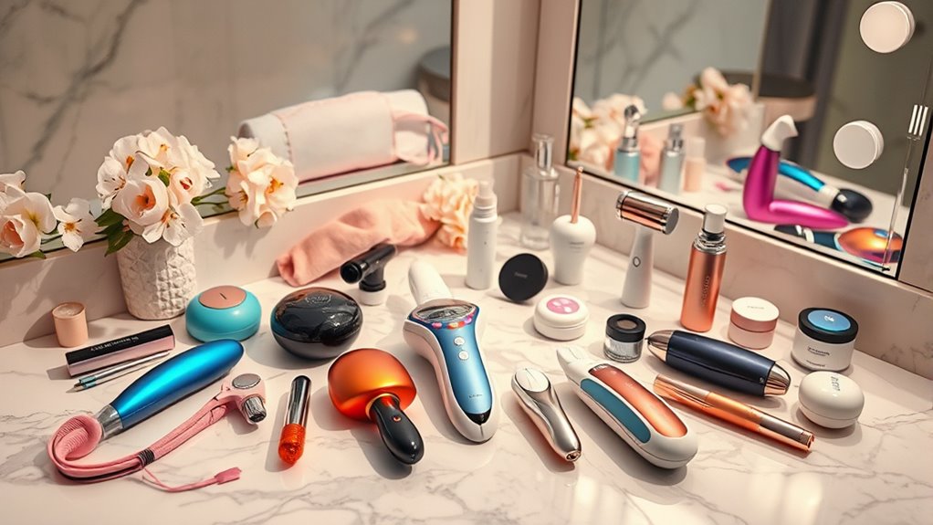 After considering how easy it is to carry beauty gadgets, I shift my focus to safety and maintenance. First, I always check that any gadget I’m eyeing is made from skin-safe, hypoallergenic materials. This helps prevent irritation or allergic reactions. Next, I make it a point to regularly clean and disinfect my devices according to the manufacturer’s instructions to keep everything hygienic. I also look for gadgets with easy-to-replace parts or covers, as this simplifies maintenance and extends their lifespan. Safety features, like automatic shut-off, are vital to avoid overheating or accidents. FINALLY, I review the manufacturer’s guidelines for maintenance frequency to guarantee my gadgets operate safely and effectively over time.
