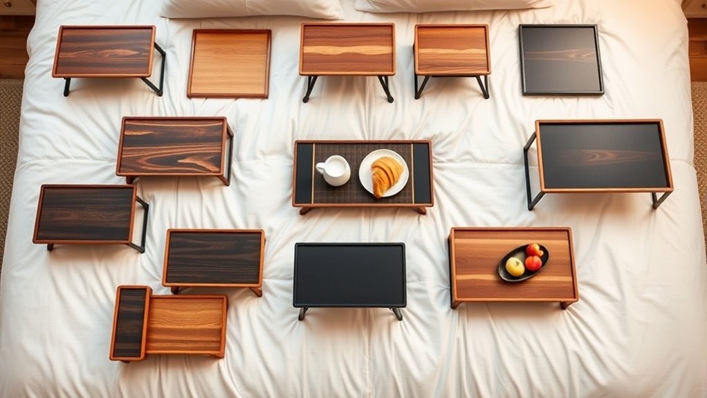 If you’re looking for the best bed tray tables for comfort and fun, I’ve found some great options. From adjustable lap desks to foldable trays with storage, there’s something for every need. These tables are lightweight, versatile, and stylish, making lounging or dining effortless. They support laptops, snacks, or even crafts, all while adding a touch of convenience to your relaxation spots. Keep going to discover the top choices that suit your style and needs.