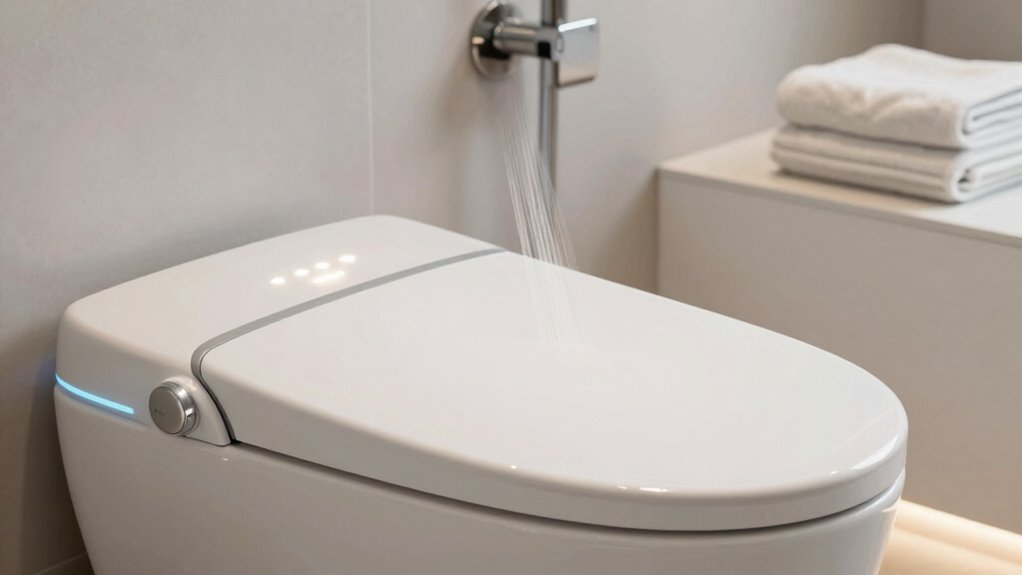Imagine a cozy fire flickering softly—that’s how energy-efficient these heated bidet seats are. They use minimal power, thanks to smart designs and adjustable settings, helping you save on energy bills without sacrificing comfort. I’ve found they’re quite eco-friendly, especially when you use features like automatic shut-off. So, you get warmth and convenience while being mindful of energy use, making them a smart choice for your home.