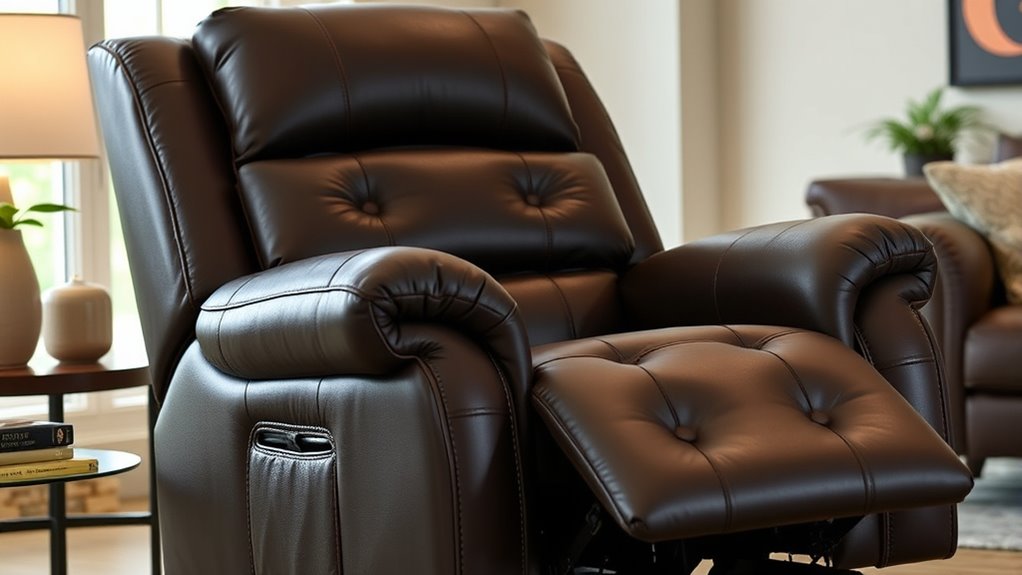 Ever wonder how to guarantee your lift chair provides all-day comfort? It starts with choosing the right seat dimensions. I recommend a seat width of at least 22 inches to comfortably fit larger users without feeling cramped. The seat depth should be 20 inches or more to ensure proper thigh support, reducing fatigue. Look for chairs with adjustable lumbar and head supports—these features let you customize your comfort level throughout the day. Thick, high-density padding is essential to prevent pressure points, especially during extended sitting. Ultimately, always verify the weight capacity; it should exceed 400 pounds for safety and durability. Prioritizing these factors ensures your lift chair offers the support and comfort you need, day in and day out.