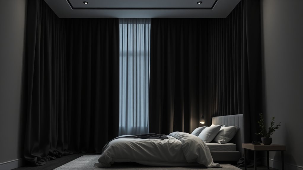 Thicker blackout curtains with multiple layers and dense fabrics are essential for effectively reducing noise. Curtains with triple-weave technology or added insulation can cut ambient noise levels by up to 30%, making your bedroom much quieter. The fit also matters—grommet or rod pocket styles that sit snugly against the window frame help block out external sounds by minimizing gaps. Heavier materials like velvet or tightly woven polyester are especially good at muffling outside noise compared to lighter fabrics. Proper installation is key; full-length curtains that cover the entire window and frame prevent sound leaks and boost noise reduction. Overall, choosing curtains with dense fabrics, layered construction, and a secure fit creates a more peaceful, sleep-friendly environment.