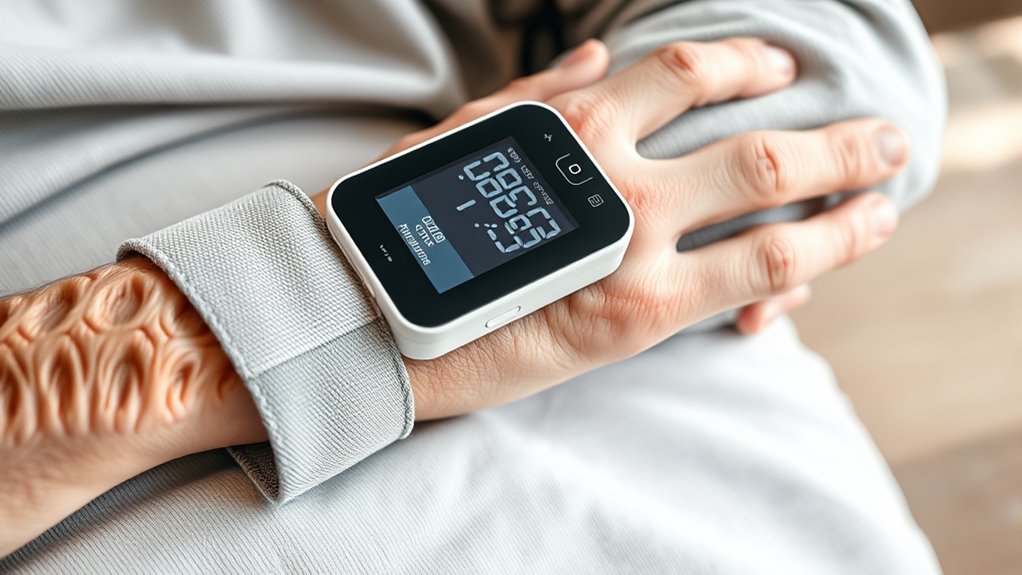 Selecting the right blood pressure monitor for seniors hinges on ensuring the cuff fits properly. A cuff that’s too tight or too loose can lead to inaccurate readings. Look for monitors with adjustable cuffs that fit arm circumferences typically ranging from 8.7 to 16.5 inches. It’s crucial to verify the device can accommodate the specific arm size to prevent errors. Comfort is also key; choose soft, gentle cuffs that don’t cause discomfort during repeated use. Additionally, opt for monitors with large, easy-to-read displays and clear indicators, which help seniors with visual impairments. Proper fit and size not only improve accuracy but also make regular monitoring less stressful and more comfortable, encouraging consistent health tracking.