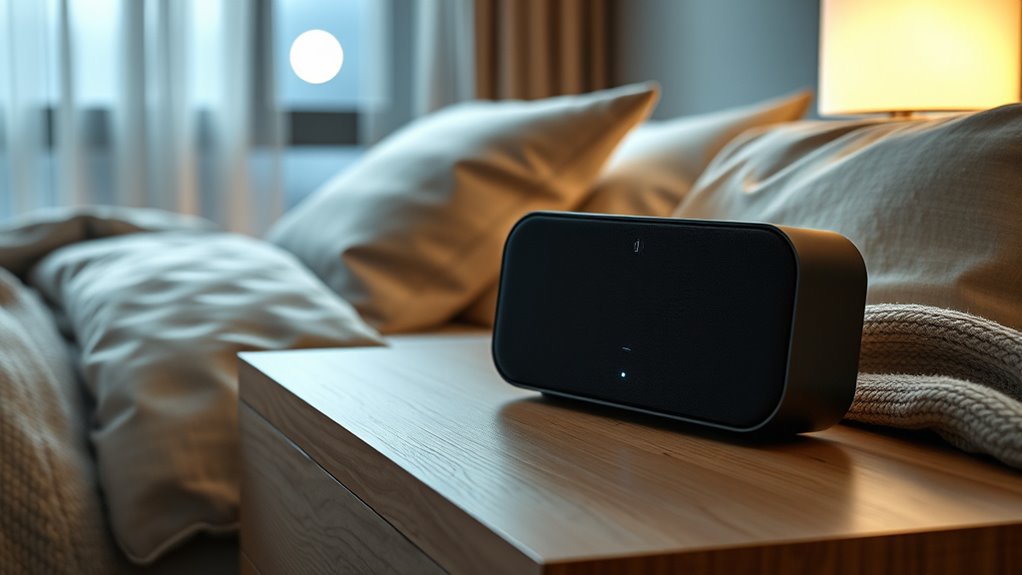 When selecting a Bluetooth sound machine, I pay close attention to its timer and memory features because they directly impact my relaxation routine. I look for multiple timer options—like 1, 2, or 4 hours, or continuous play—to match my needs. Memory functions are vital; they save my preferred sound, volume, and light settings, so I don’t have to readjust every night. Some devices automatically resume the last used settings upon restart, which makes things seamless. I also appreciate fade-out timers that gently decrease volume, preventing abrupt stops that could disturb sleep. User-friendly controls for setting timers and managing memory make the device more convenient and effective, ensuring I can create my ideal sanctuary quickly and easily each night.