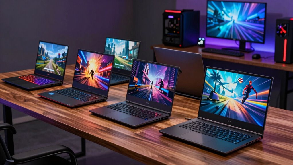 Balancing cooling performance with portability is essential for a budget VR-ready gaming laptop, as both factors directly impact your gaming experience. Effective cooling systems, like dual fans and exhaust vents, prevent overheating during long gaming sessions and help maintain consistent performance. Portable gaming laptops usually weigh between 4 to 5 pounds, making them easier to carry without sacrificing cooling efficiency. However, thinner designs can restrict airflow, so finding a balance is vital. Proper ventilation and heat management not only protect your hardware but also extend its lifespan. Many compact models now include software to monitor and optimize thermal performance, ensuring that your gaming remains smooth and reliable. Prioritizing both cooling and portability helps you enjoy VR gaming without compromises.