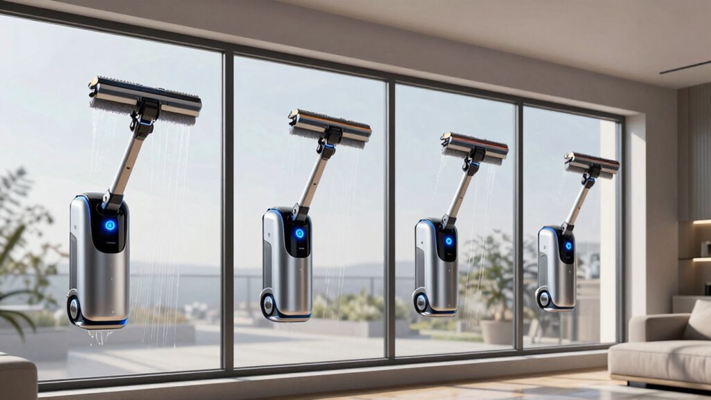 Think of budget robots as the trusty sidekicks of window cleaning—they’re great for easy-to-reach spots but might struggle with high or hard-to-reach windows, much like a sidekick who’s brave but not a superhero. I’ve found they’re best for standard windows around the house. For tough spots, investing in a more advanced model or professional help guarantees your windows receive the attention they deserve without risking damage.