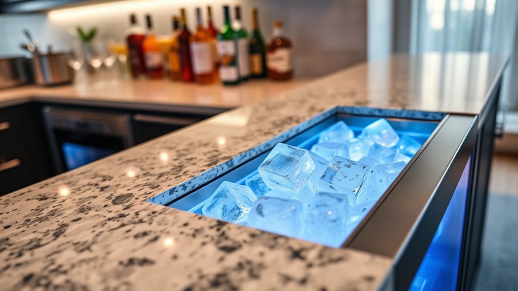 Choosing a built-in ice maker that complements your home bar’s style is essential for creating a cohesive and attractive space. I recommend matching the finish and design to your existing decor, whether that’s sleek stainless steel for a modern look or panel-ready models for seamless integration. It’s also important to verify the installation dimensions to ensure the unit fits comfortably without blocking other fixtures or cabinetry. Consider your ventilation setup—if the ice maker has front venting, make sure it aligns with your kitchen or bar’s airflow. Ultimately, select a model with a door style that matches your cabinetry hinges, whether that’s reversible or soft-close, to enhance user convenience and maintain aesthetic harmony.