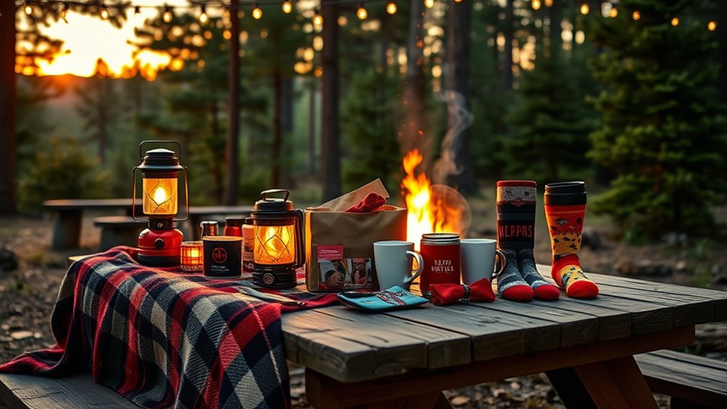 Ever wondered how to make camping gifts truly special? I suggest adding personal touches like engraved multi-tools, custom-printed water bottles, or monogrammed camping mugs. Think about his favorite colors or hobbies—maybe a personalized camping journal or a photo keychain. These thoughtful details show you care and make the gift memorable. Have fun customizing, and he’ll cherish your effort every time he heads outdoors!