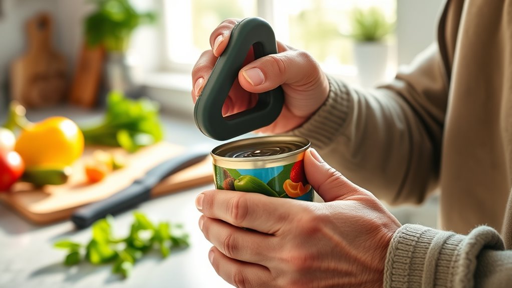 An ergonomic design makes a significant difference in how easy and comfortable it is for seniors to open cans. I look for can openers with soft, non-slip handles that reduce hand fatigue and provide a secure grip. Oversized knobs or handles make turning easier, requiring less force, which is especially helpful for those with limited strength. Handles that are curved or contoured fit comfortably in the hand, minimizing strain and enhancing control. Many ergonomic models feature smooth, easy-to-turn mechanisms that demand less manual effort, making them ideal for arthritis sufferers. Prioritizing ergonomic design also enhances safety by reducing slips and injuries during use. Overall, a thoughtful ergonomic design can transform a challenging task into a much simpler, safer experience for seniors.
