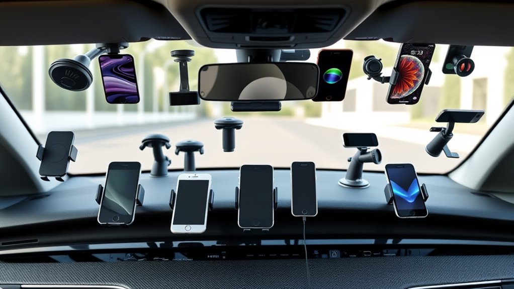 If you’re looking for the best car phone mounts of 2025, I’ve found some great options that prioritize safety and convenience. From magnetic mounts with powerful suction and MagSafe compatibility to versatile vent, dashboard, and windshield holders, these mounts are designed for durability, easy one-hand operation, and secure device hold. They also come with safety certifications and weather resistance features. Keep exploring, and you’ll discover the top picks that fit your driving needs perfectly.
