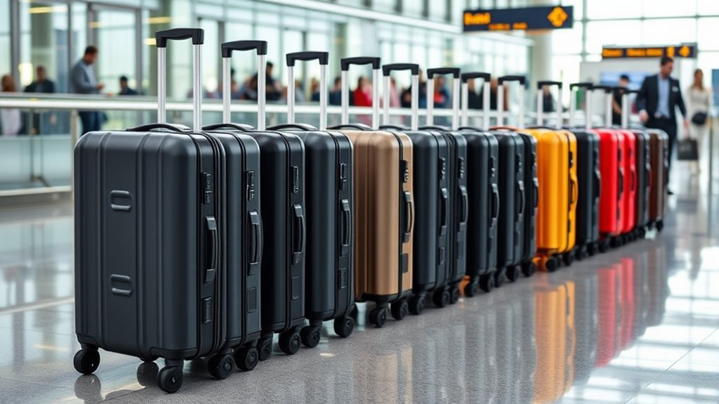 Ensuring your carry-on suitcase meets airline weight and size limits is essential for a smooth journey. Typically, airlines allow dimensions around 22 x 14 x 9 inches, including the battery and wheels. I always check these measurements before purchasing, making sure my suitcase complies. The suitcase’s weight should usually stay under 10 pounds to avoid exceeding carry-on weight restrictions, which are often around 22-26 pounds with everything inside. I also verify the weight of the removable battery separately, ensuring the combined weight stays within limits. Additionally, I consider the strength of the handle and wheels to support the total weight without damage. Being mindful of these limits helps prevent surprises at the gate and keeps my travel smooth and hassle-free.