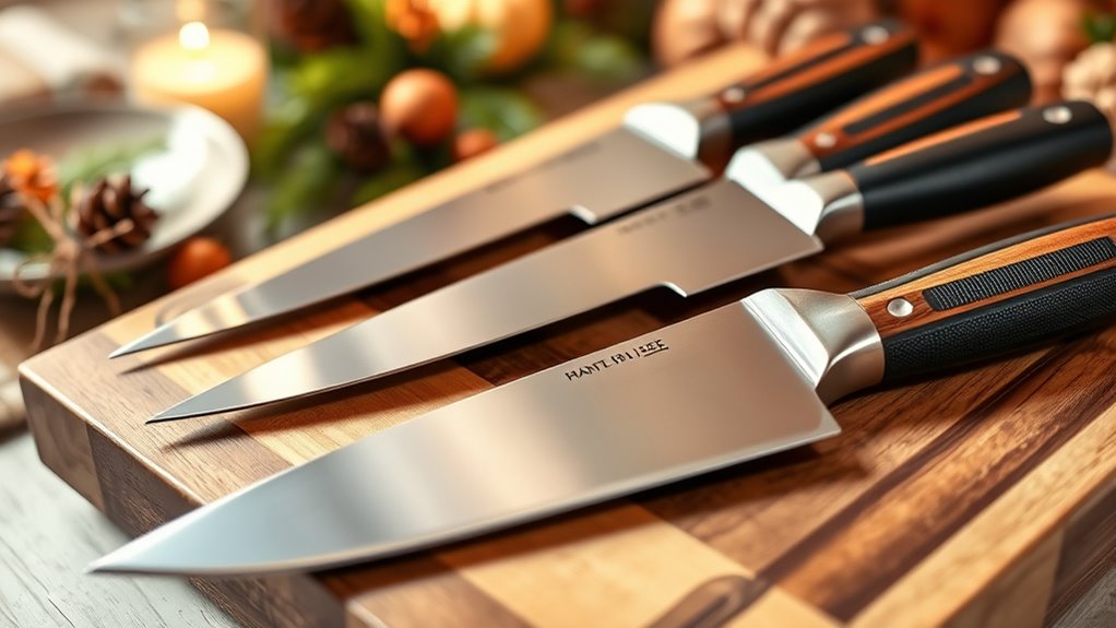 Selecting a carving knife set that’s built to last is vital, especially when preparing holiday turkey. High-carbon stainless steel blades are a top choice because they keep their edge longer and resist rust and corrosion, guarantee consistent performance. Full tang construction improves durability and provides better balance, making slicing easier without wobbling. Forged blades tend to be stronger and less prone to chipping than stamped ones, offering added reliability. Handles made from G-10, pakkawood, or durable plastics not only last longer but also provide a comfortable grip during extended use. Proper maintenance, like hand washing and regular honing, is essential to extend the lifespan of your knives. Investing in quality materials ensures your carving set remains sharp, functional, and beautiful for many holiday seasons.
