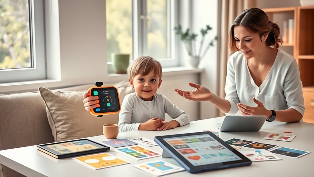 Choosing a communication aid that’s easy to use is essential to guarantee non-verbal patients can operate it confidently and independently. An intuitive layout allows users to understand and navigate the device quickly, without needing extensive training. Large, clear symbols, words, or pictures enhance readability and help users formulate messages faster. Devices should feature simple interfaces with minimal buttons and straightforward functions to reduce cognitive load and make operation more accessible. Features like easy finger sliding or touch activation are crucial for those with limited motor skills, ensuring effective use. Additionally, clear instructions or visual cues help both users and caregivers operate the device confidently, minimizing frustration and promoting smoother communication. Ease of use directly impacts the user’s independence and overall experience.