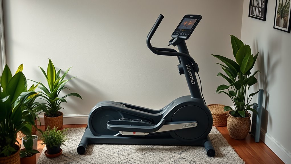 Choosing a compact elliptical machine that fits seamlessly into your space requires careful attention to its design. Look for models measuring under 50 inches in length and width to ensure they suit small rooms or apartments. Foldable designs are a huge plus, allowing you to store the elliptical easily when not in use and maximize your space. A slim profile and minimal footprint help keep your workout area uncluttered and versatile. Many models come with transport wheels, making it simple to move and reposition the machine as needed. By prioritizing a space-efficient design, you can enjoy effective workouts without sacrificing valuable room. A well-designed elliptical not only saves space but also adds convenience and flexibility to your fitness setup.