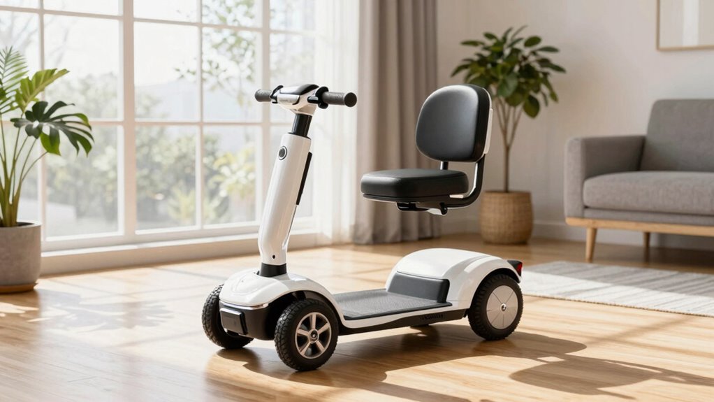 Choosing a compact mobility scooter for an apartment means paying close attention to size and maneuverability. These scooters are designed to fit into tight indoor spaces, with a smaller footprint that makes steering hallways and rooms easier. A tight turning radius, often under 50 inches, helps you steer through narrow doorways and around furniture effortlessly. Light designs, usually under 50 pounds, make lifting, storing, and transporting simpler. Foldable or disassemblable models are especially convenient, allowing quick storage when not in use and easy transport outside the apartment. Narrower widths, typically between 17 and 23 inches, guarantee smooth guidance through tight doorways and narrow corridors. Overall, these features make compact scooters highly suitable for confined living spaces without sacrificing mobility.