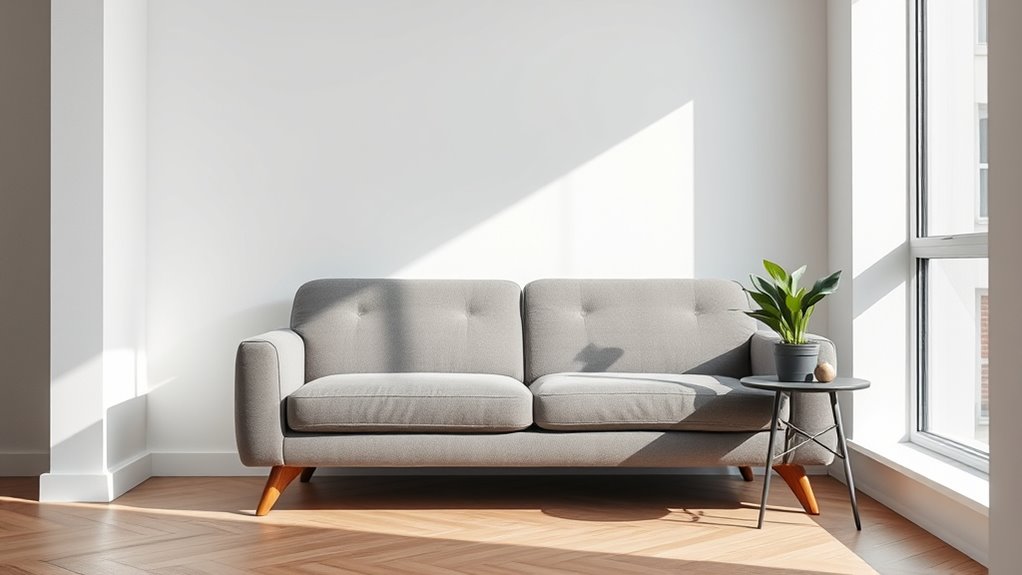 Durability and material quality are vital considerations because they directly impact how well a sofa holds up over time in an apartment setting. I look for high-quality, resilient materials like reinforced hardwood frames and corrosion-resistant metal legs, which guarantee longevity and withstand daily use. Upholstery fabrics such as heavy-duty faux leather, stain-resistant corduroy, or tightly woven chenille help maintain their appearance despite spills, pet scratches, or wear. I also prioritize foam cushions filled with high-resilience or high-density foam that provide consistent support without sagging. The construction details, like reinforced stitching and sturdy joints, are essential for preventing rips and structural issues. Regular maintenance with easy-to-clean fabrics and removable covers can further extend the sofa’s lifespan, keeping it looking fresh for years.