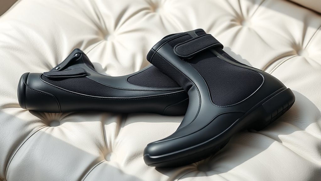 When selecting compression boots, ease of use and intuitive controls can make a significant difference in your experience. Look for devices with ergonomic, simple control panels or handheld remotes that let you adjust settings effortlessly. Clear labels for modes, intensity levels, and heat options help you customize quickly without confusion. Backlit displays or glowing buttons improve visibility, especially in low-light environments. Some models feature preset memory functions that automatically recall your favorite settings, saving time and effort. Safety features like auto shut-off timers are also essential—they prevent accidental overuse and ensure safe operation. Overall, choosing a device with straightforward controls makes recovery more convenient, allowing you to focus on comfort and relief without hassle.