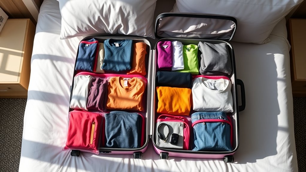 For travelers looking to maximize their luggage space, compression packing cubes with a double-zipper system are the perfect solution. They reduce clothing volume by up to 60%, allowing me to pack more efficiently. Simply fold or roll clothes, stack them neatly, and zip the cube. The double-zipper design makes compression easy and prevents fabric snagging. Made from waterproof, tear-resistant polyester, these cubes are durable and lightweight. Their versatile sizes fit various clothing types and are suitable for different trips—whether flying, camping, or business travel. Plus, mesh panels help me quickly see what’s inside, keeping everything organized and accessible.