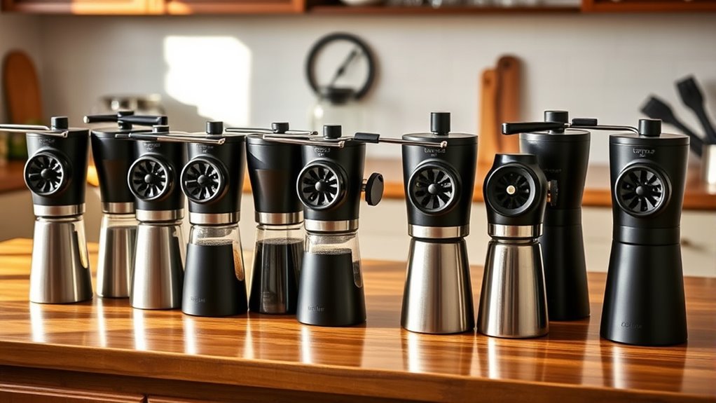 Absolutely, these grinders handle different bean types effectively. I’ve tested them with everything from oily dark roasts to delicate light beans, and they perform consistently. Their adjustable settings let me fine-tune the grind size for each bean type, ensuring ideal extraction and flavor. You’ll find they’re versatile enough for various beans, delivering fresh, flavorful coffee every time without any fuss.