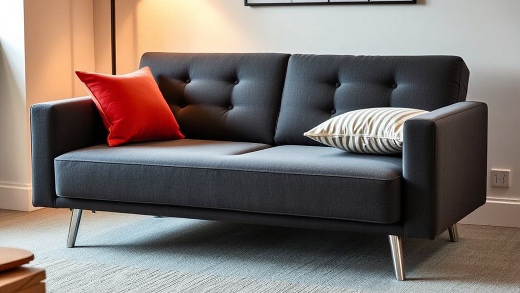 When evaluating convertible chair beds for small spaces, material durability plays a vital role in guaranteeing longevity and reliable performance. I look for fabrics made from high-quality polyester with abrasion- and stain-resistant finishes, as they keep the furniture looking new longer. Reinforced stitching and sealed seams prevent tearing and fraying, which is essential in tight quarters. A sturdy frame, often made from metal or reinforced wood, provides solid support and reduces wear over time. I also prioritize dense foam or shredded foam fillings that resist sagging, maintaining comfort after multiple conversions. These durable materials ensure that my chair bed remains functional and stylish, even with frequent use, making it a smart investment for small spaces.