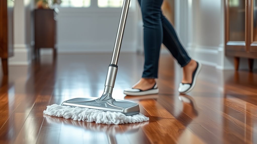 Choosing a cordless wet/dry vacuum mop system that matches your floors is essential for effective cleaning and long-term durability. You need to verify the device is compatible with your specific floor types, whether hardwood, tile, laminate, stone, marble, or vinyl. Look for models with adjustable water flow settings to tailor cleaning to each surface, preventing damage and ensuring thorough results. Confirm that the technology is suitable for sealed surfaces to avoid water infiltration and potential damage. Additionally, check for specialized attachments or features designed for hard-to-reach areas or particular surfaces, which can make cleaning more efficient. Finally, consider the materials and components to ensure they resist wear and are built for frequent use on your floors, maximizing both longevity and performance.