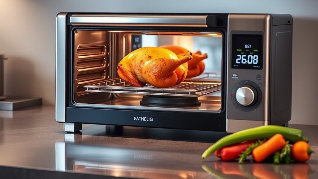Choosing a counterconvection oven with rotisserie means looking for versatile cooking functions that can handle a variety of recipes. I focus on models that offer baking, broiling, toasting, roasting, and dehydrating to maximize their use. Additional features like air frying, slow cooking, or warm settings expand culinary options, making the oven more adaptable. Preset programs for specific tasks simplify operation and help guarantee consistent results. Independent temperature controls for the top and bottom elements let me fine-tune each cooking mode, improving the quality of my dishes. Multi-function units that combine rotisserie with other modes allow me to prepare complex meals, such as rotisserie chicken with baked sides, all in one appliance. Versatility is key to elevating my cooking game with these ovens.