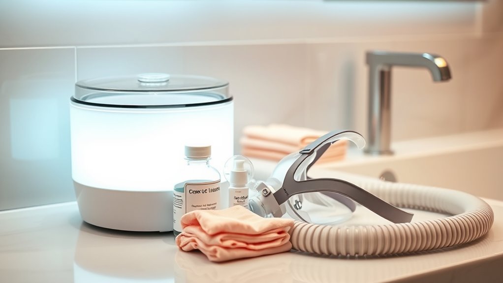 Chemical-free CPAP cleaners are gaining popularity because they disinfect effectively without relying on harsh chemicals. These options typically use UV light, ozone, or electrolyzed water to sterilize your equipment, reducing the risk of skin or respiratory irritation from chemical residues. They’re often quick, with many taking just a few minutes to fully disinfect, making daily maintenance more convenient. Plus, they’re an eco-friendly choice, producing minimal waste and pollution. For those with sensitivities or allergies to typical cleaning chemicals, these methods offer a safe alternative. Since they avoid harmful substances, they’re ideal for people seeking a gentle yet effective cleaning solution. Overall, chemical-free options combine safety, efficiency, and environmental consciousness, making them an attractive choice for maintaining your CPAP equipment.
