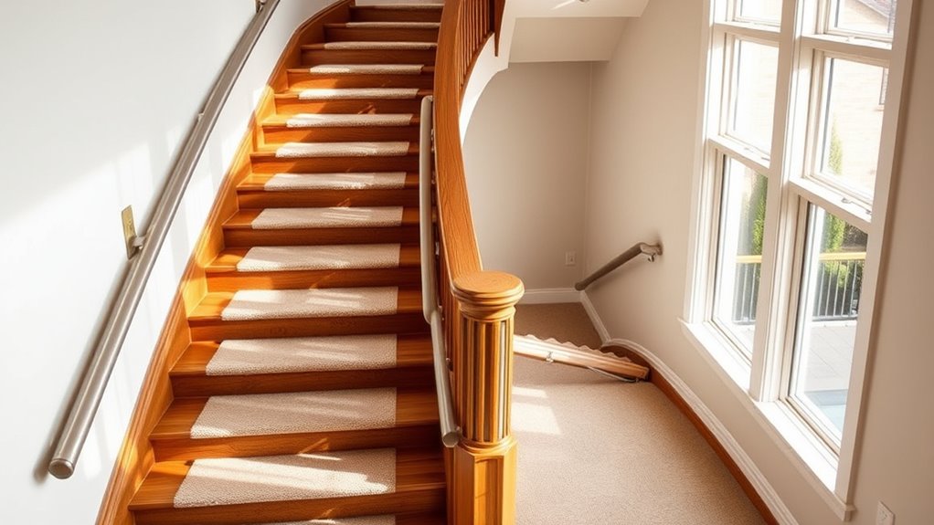 Curved stair lifts handle uneven or irregular staircases with impressive adaptability, thanks to custom-fitted rails and flexible mechanisms. I’ve seen lifts that precisely match unique stair shapes, ensuring smooth rides and safety. Their adjustable arms and flexible track systems contour to any staircase, providing comfort, stability, and security. So, whether your stairs are steep, curved, or uneven, these lifts are designed to accommodate your home’s unique layout seamlessly.