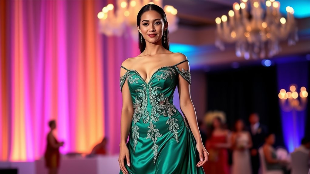 When picking the perfect designer evening gown, it’s important to take into account the occasion’s formality and style. I always consider whether the event calls for a classic, floor-length gown for black-tie affairs or a more relaxed, cocktail-length dress for less formal gatherings. Checking the dress code helps guarantee I choose an appropriate look, whether that’s a full-length gown or a chic high-low design. I also pay attention to fabrics and embellishments—luxurious materials like jacquard or beaded details suit formal galas, while lightweight fabrics are better for outdoor events. Additionally, I think about activities like dancing or standing for long periods, selecting a gown that’s both elegant and practical. Finally, I consider if the gown matches the event’s theme and my role, like a mother of the bride.