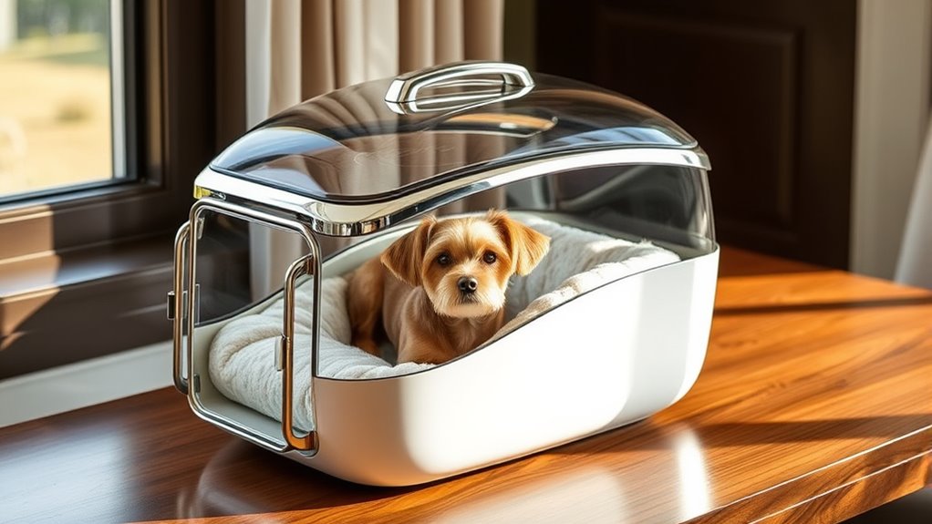 When choosing a designer pet carrier, I look for secure zippers, sturdy closures, and reinforced seams to keep my pet safe. I prefer carriers with breathable mesh panels and lockable doors for added security. A well-designed carrier also has a comfortable handle or shoulder strap for easy carrying. These features give me peace of mind, knowing my pet is secure, comfortable, and stylish during our travels.