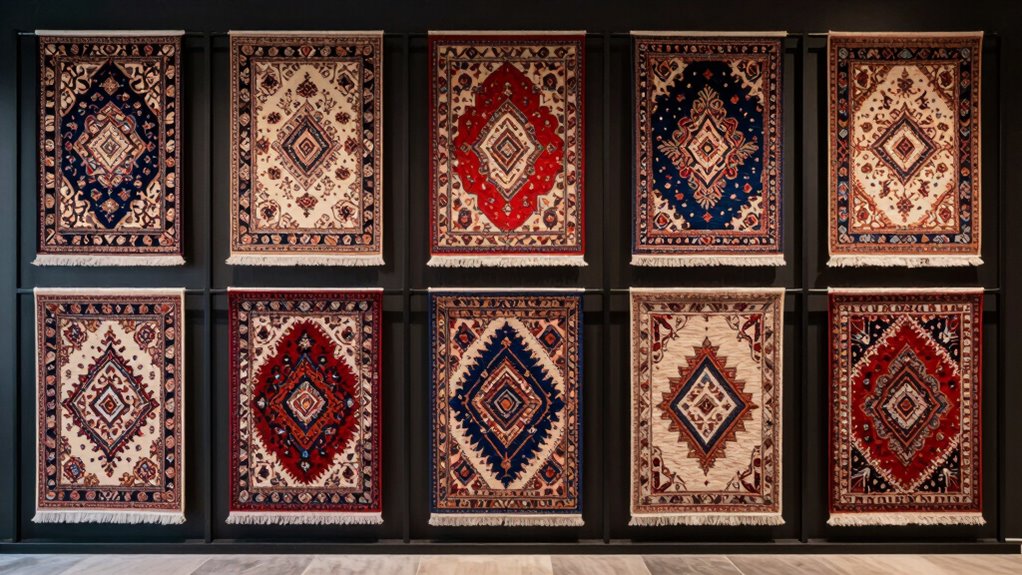 When selecting a designer rug sample display rack, I focus on several key factors to guarantee it meets my needs. I consider the material’s durability, the space required for display, and how easily I can move or rearrange it. Additionally, I look at its visual appeal and load capacity to make sure it’s both attractive and functional.