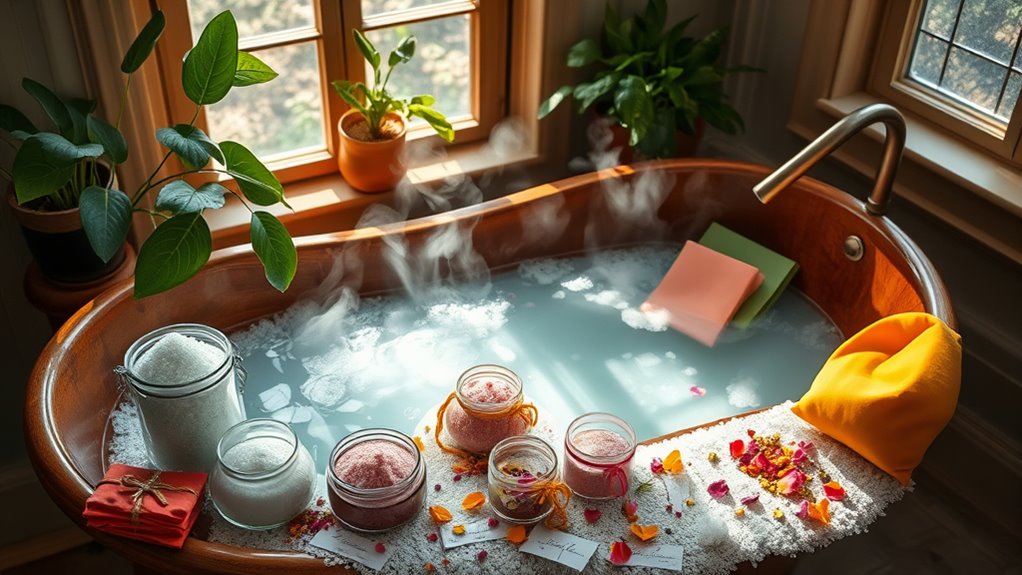 If you’re looking to refresh your skin and relax your mind, I recommend exploring the 15 best detox bath salts available now. They feature natural ingredients like Epsom salt, magnesium, clay, and essential oils such as lavender, lemon, and juniper that soothe muscles, detoxify, and uplift your mood. Each offers different benefits, from unscented, pure salts to invigorating blends, all designed to create a spa-like experience at home. Keep going to discover which options suit your needs best.