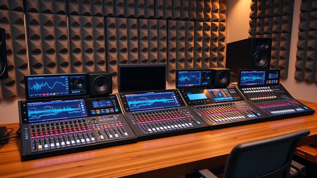 When it comes to expanding my digital mixer setup, the options are virtually limitless—I can add countless channels, effects, and even integrate with external hardware seamlessly. Most modern digital mixers support daisy-chaining, network integration, and software upgrades, making scalability effortless. This flexibility guarantees my studio can grow as my needs evolve, transforming my setup into a powerhouse capable of handling anything from small projects to massive productions with ease.