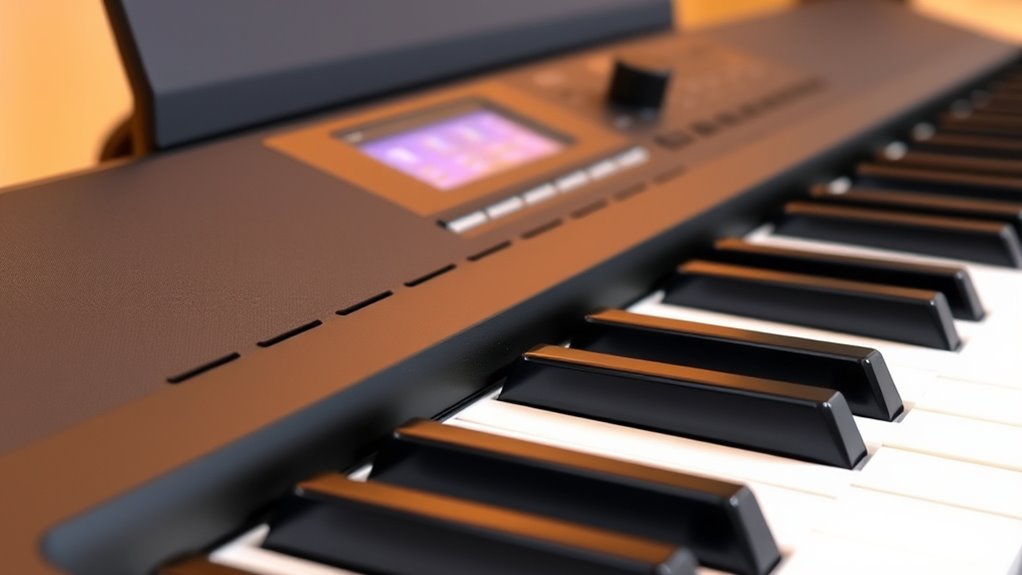 Choosing the right digital piano involves more than just considering its features; your budget plays a significant role in narrowing down options. Digital pianos range from under $300 to over $2000, so setting a clear budget helps you focus on models that fit your financial limits. Cheaper options might have fewer sounds, limited connectivity, or less realistic key action, while pricier models usually offer advanced features and better touch. Remember to account for extra costs like stands, pedals, headphones, and software, which can add up quickly. Balancing price with essential features guarantees you get a digital piano that meets your needs without overspending. Being clear about your budget helps you make smarter choices and find the best instrument for your playing style and goals.