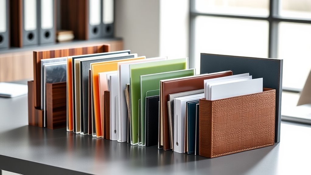 When considering environmentally friendly document holder choices, I look for options made from recycled or sustainable materials like bamboo, recycled plastic, or biodegradable composites. These choices help reduce plastic waste and promote eco-conscious practices. I also check if the manufacturer follows sustainable production methods. Switching to eco-friendly holders not only keeps my desk organized but also aligns with my values of caring for the planet.