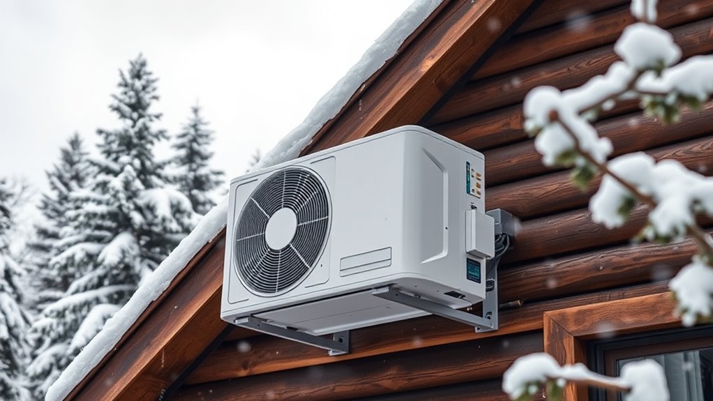 Energy efficiency ratings play a crucial role in guaranteeing your ductless mini split heat pump performs well in cold climates. Higher SEER2 ratings mean better energy efficiency, which helps reduce operating costs during winter. Inverter technology is a key factor—by adjusting the compressor’s speed, it optimizes power use and maintains consistent heating even in low temperatures. Ratings like HSPF2 specifically measure heating performance; higher values indicate more efficient operation in cold weather. For effective heating, look for units with a minimum SEER2 of 17 and an HSPF2 of 9.1 or higher. These ratings ensure your heat pump can reliably operate at outdoor temperatures down to -13°F or lower while still delivering high efficiency, saving you money and keeping your home warm throughout winter.
