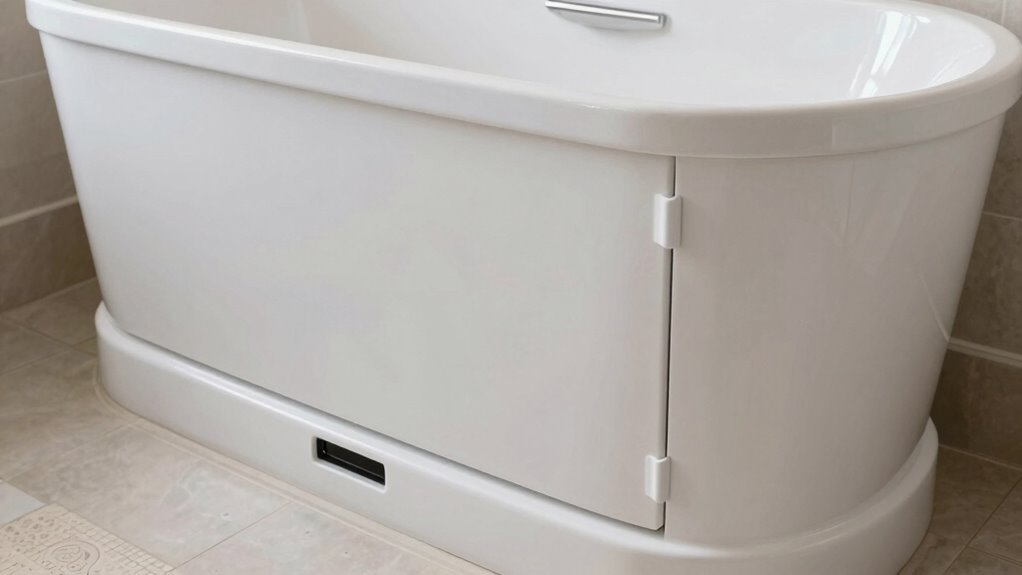 Considering the installation process carefully can save you time and prevent surprises down the line. First, check that your bathroom has enough space and proper plumbing to support the tub. Reinforced floors and walls are essential, especially for models with additional features like jets or lift systems, to guarantee safety and stability. You’ll also want to see if any plumbing adjustments or waterproofing are needed for a smooth setup. Make sure the doorway or entryway is wide enough to move the tub in easily without risking damage or injury. Finally, review the manufacturer’s installation instructions to determine if professional help is recommended or required. Taking these factors into account helps secure your new easy-entry bathtub fits perfectly and is installed safely.