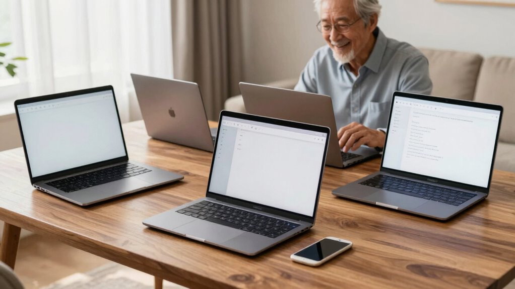 If you’re searching for the best easy-to-use laptops for seniors in 2026, I recommend considering models like the Lenovo IdeaPad Slim 3 Chromebook, HP 15.6″ Laptop with Windows 11, HP Rose Gold Ultrabook, Lenovo IdeaPad 3i Chromebook, and HP 14 Laptop. These options have large screens, clear audio and video, simple interfaces, and great portability to keep you connected effortlessly. Keep exploring further, and you’ll find even more helpful details to find the perfect fit.