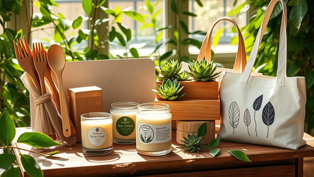 Since eco-friendly gifts are meant to last, their durability and reusability play a crucial role in making sustainable choices. Items made from sturdy materials, like bamboo utensils or glassware, can be reused countless times, reducing waste and the need for frequent replacements. Plantable seed paper extends its usefulness by transforming into plants, promoting ongoing environmental benefits. Gifts crafted with eco-conscious materials tend to have longer lifespans, resisting wear and tear over time. The quality of craftsmanship also matters—well-made products are more resistant and reliable. By selecting reusable and durable eco gifts, you’re not only giving something meaningful but also ensuring that your gift continues to positively impact the planet far beyond its initial use. Longevity truly makes a difference.