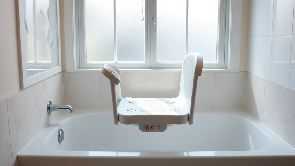 Choosing the right electric bath lift also means considering its size and portability. I look at the overall dimensions and weight to guarantee it fits comfortably in my bathroom and is easy to move or store. Lightweight, foldable models are ideal because they can be transported between rooms or tucked away in small spaces without sacrificing stability or safety. Built-in handles or carrying features make repositioning straightforward. I also evaluate the seat and backrest size to make sure they provide enough comfort without causing strain during transfers. The lift’s foldable components and manageable weight are essential for ease of use and storage, especially if I need to handle it alone. This way, I find a lift that’s both practical and comfortable for daily use.