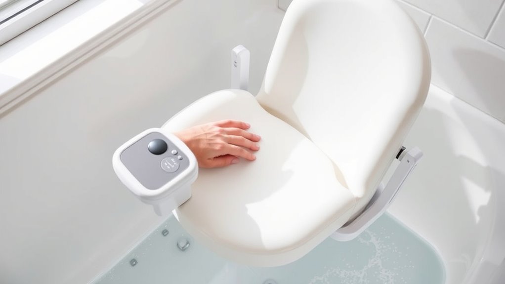 Safety features are the backbone of a reliable electric bath lift, especially for seniors who need extra security during transfers. I look for models with emergency stop buttons and non-slip surfaces to prevent accidents. Stability-enhancing elements like suction cups, safety belts, and anti-slip padding help keep users secure during use. Checking for safety certifications, such as IPX waterproof ratings and appropriate load capacities, ensures the lift meets reliable standards. Intuitive, waterproof controls are essential so I can operate the lift easily and respond quickly in emergencies. Backup power options or emergency lowering functions are also critical, providing peace of mind if the main power fails. These safety essentials help create a secure, dependable bathing experience for seniors.
