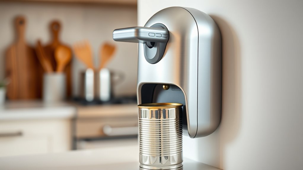 Did you know that ergonomic design is a key feature in over 80% of electric can openers for seniors? I find that these models often have soft, non-slip grips and easy-to-press buttons, making operation smoother and less tiring. I personally prefer those with curved handles that fit comfortably in my hand. They truly make opening cans safer and more effortless, especially for anyone with limited hand strength or arthritis.