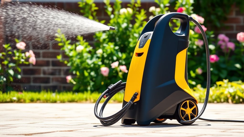 Choosing a durable electric pressure washer means paying close attention to its construction and components, since these determine how well it withstands regular use and tough conditions. I look for models with heavy-duty frames made of metal or reinforced plastic, ensuring they won’t easily break or warp. High-quality pumps, like axial cam or piston types, are key for consistent performance and longevity under heavy workloads. Materials such as brass or stainless steel for nozzles and connectors offer corrosion resistance, extending their lifespan. A robust motor, especially brushless or induction types, reduces wear and tear, helping the washer run smoothly over time. Additionally, impact-resistant housings and reinforced hoses protect against accidental drops and high-pressure stress, making these tools reliable for demanding cleaning tasks.