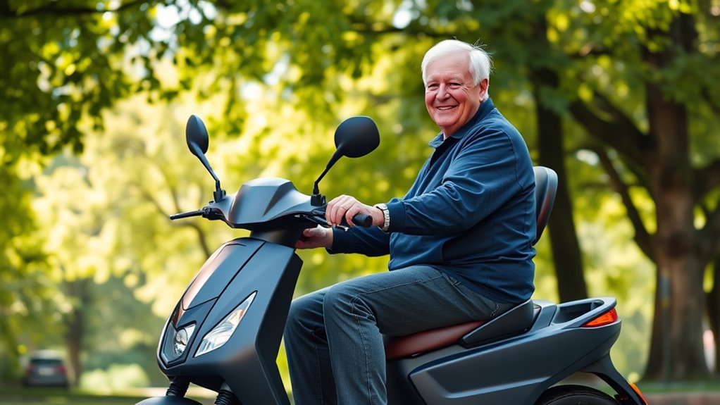 Choosing the right electric scooter for seniors means paying close attention to safety features that keep riders stable and secure. Features like anti-tip wheels and anti-collision bars help prevent accidents and guarantee stability on different terrains. Bright headlights, taillights, and reflective elements improve visibility in low-light conditions, reducing collision risks. Emergency brake systems and responsive controls allow quick stops and better control, boosting confidence and safety. Electromagnetic brakes and anti-rollover devices provide reliable stopping power and prevent rollover accidents. Security features such as alarms and lockable controls help prevent theft and unauthorized use. These safety features are essential because they directly impact a senior rider’s confidence and safety, making the riding experience enjoyable and worry-free. Prioritizing safety ensures peace of mind every time I ride.