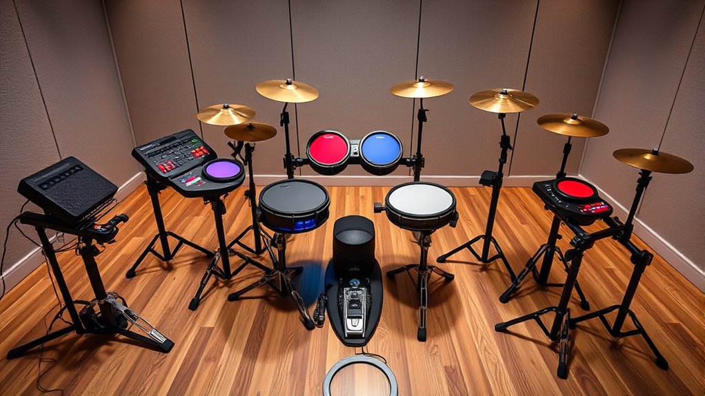 If you’re looking to improve your drumming practice and performances, I recommend checking out my list of 10 top electronic drum sets. These models feature authentic mesh pads, versatile sound libraries, and great connectivity options like Bluetooth and USB MIDI. Whether you’re a beginner, student, or pro, each set offers something special to suit your needs. Keep going, and you’ll discover which options best match your goals.