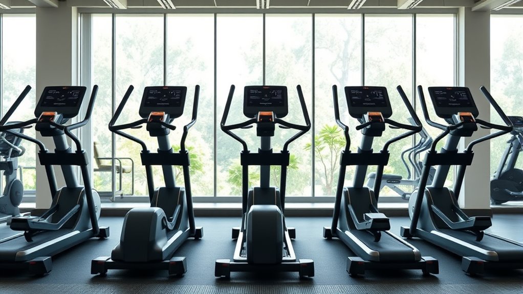 Modern elliptical machines with incline features often come equipped with digital connectivity options that enhance the workout experience. Bluetooth and Wi-Fi capabilities let me easily connect to fitness apps and devices, making tracking progress seamless. These features give access to online workout programs, virtual classes, and scenic tours right from the machine, keeping workouts engaging. I can synchronize real-time data like heart rate, calories burned, and distance with compatible apps, providing a clear picture of my progress. Digital connectivity also boosts motivation through social sharing, achievement badges, and virtual challenges, adding a fun competitive edge. Plus, firmware updates via internet guarantee my elliptical stays current with the latest features and improvements, making it a smart investment for anyone serious about staying connected and motivated during workouts.