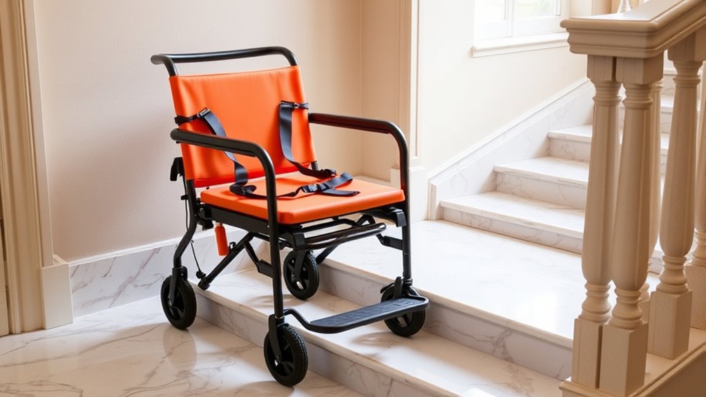 Emergency evacuation chairs are designed to handle uneven or slippery stairs with stability and safety. I guarantee they have sturdy, non-slip wheels and anti-slip footrests, which help maintain traction on slick surfaces. Their construction often includes secure harnesses and adjustable features, allowing me to keep the person safe and balanced. Proper training on their use boosts confidence, making sure I can navigate challenging stairs smoothly during emergencies.