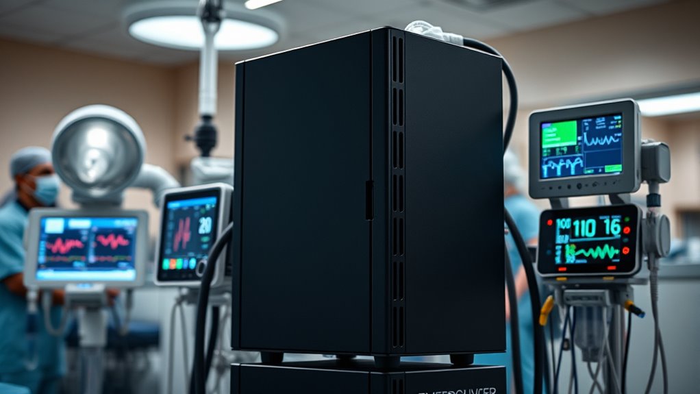 Selecting an emergency power supply that’s both safe and reliable is essential for protecting sensitive medical equipment during outages. I look for units with an advanced Battery Management System (BMS) that monitors voltage, temperature, and current, ensuring safe operation. Multiple safety features like overload protection, short circuit prevention, overcharging safeguards, and thermal regulation are must-haves to prevent hazards. I also verify that the power source delivers consistent, clean power, such as pure sine wave AC outlets, to shield equipment from fluctuations. Durability matters too—I prefer systems supporting over 1,000 charge cycles for long-term reliability. Finally, I verify the device has proper certifications, like ETL, confirming it meets safety standards. Prioritizing these factors guarantees a safe, dependable power backup during critical moments.