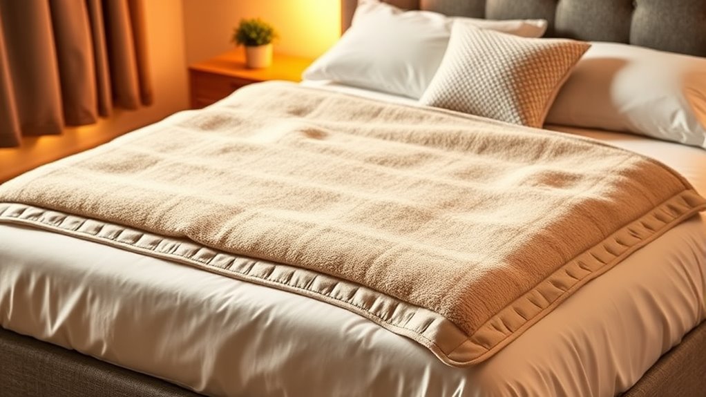 I recommend replacing your electric blanket every 5 to 7 years for peak efficiency. Over time, wear and tear can reduce its heating performance and safety, even if it still looks good. Regularly inspecting for frayed wires or melted spots helps, but upgrading guarantees you get the latest safety features and energy-saving technology. Staying current with replacements keeps you warm, safe, and saving on energy bills.