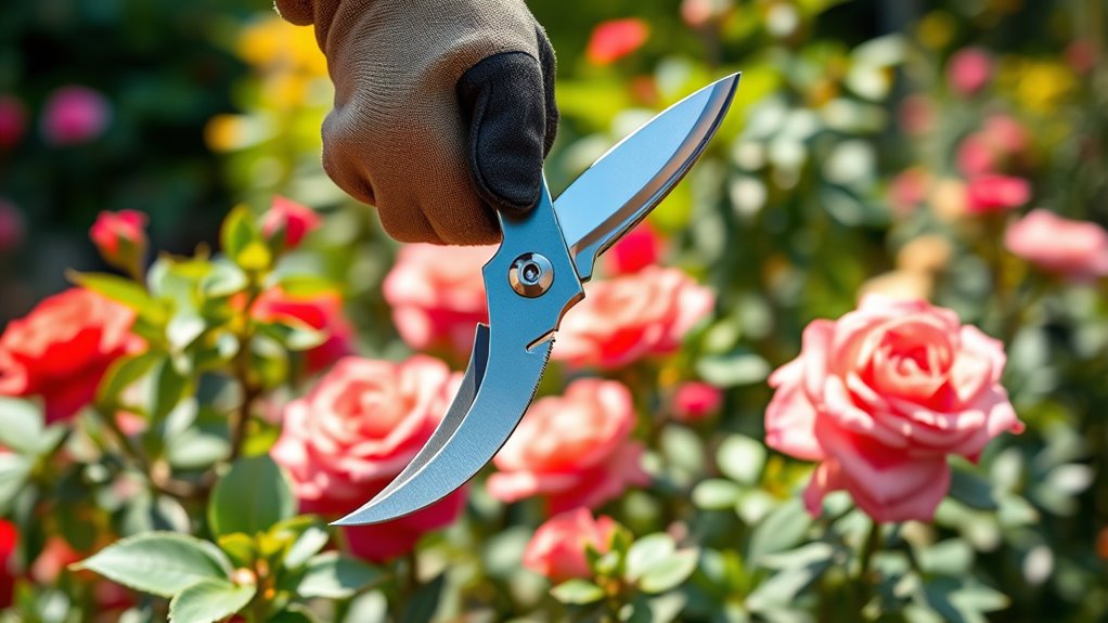 Think of pruning shears like fine-tuned instruments that need regular care to stay sharp. I recommend cleaning the blades after each use with a damp cloth and oiling the pivot points monthly to prevent rust. Sharpen the blades as needed, especially if they start to drag. Check the handles and springs for wear, replacing parts if necessary. Proper maintenance keeps my shears performing like an extension of my hand.
